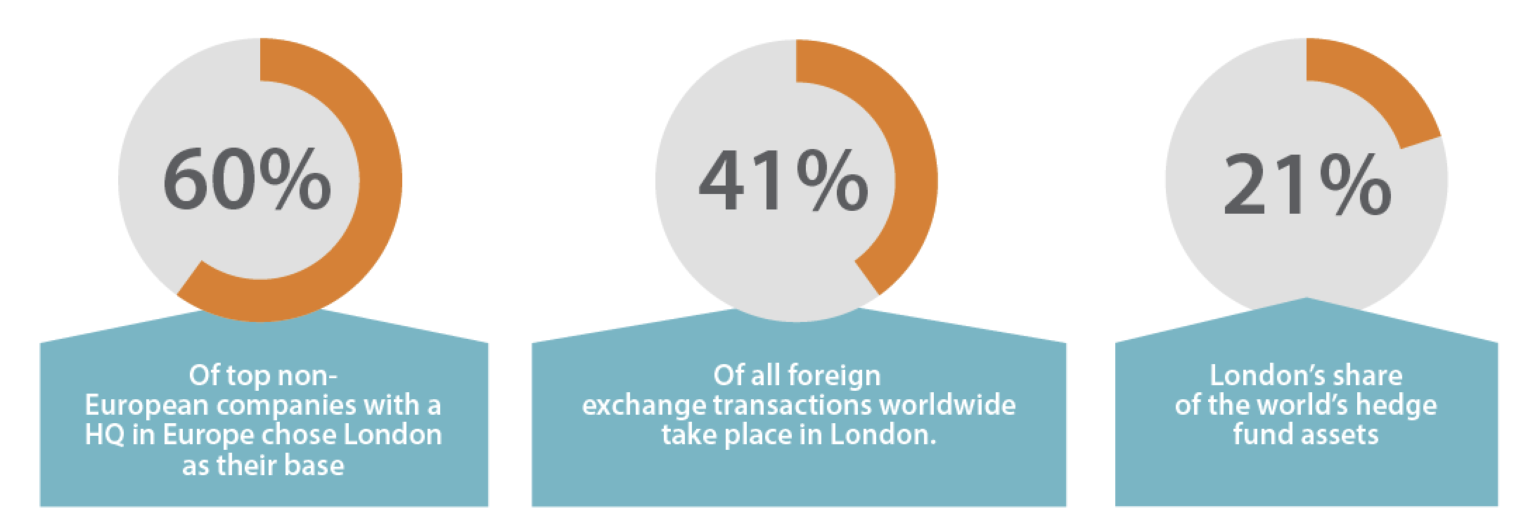 - The importance of the UK’s financial sector and in particular its dominant position in non-EU finance. About 41% of all foreign exchange transactions worldwide take place in in London. This is in addition to 62% of all yuan-denominated transactions taking place outside of China. British stock exchanges are the 3rd biggest globally by market capitalisation and London holds 21% share of the world’s hedge fund assets.