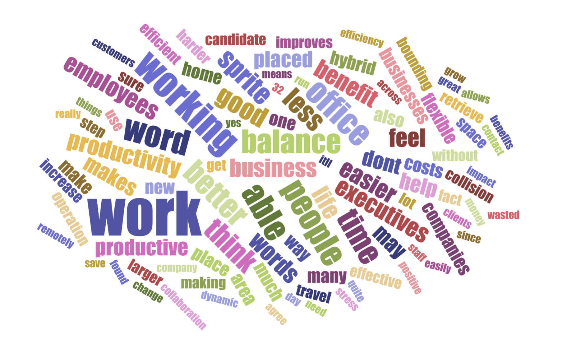 We also asked respondents how they felt executives being able to use hybrid working may benefit a business. To help judge sentiment, their responses (restricted to the top 150 words) have been entered into a word cloud, shown below (via https://www.jasondavies.com/wordcloud/)